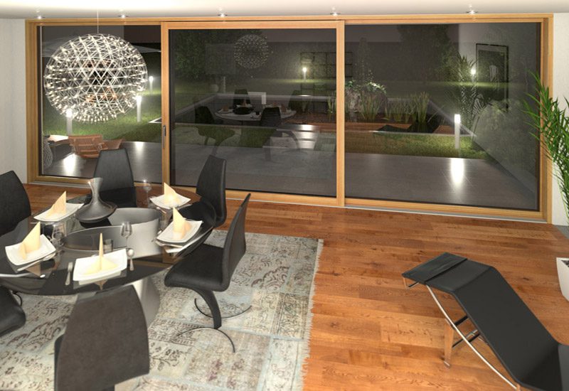 - Festverglasung mit bodentiefen Glasflächen