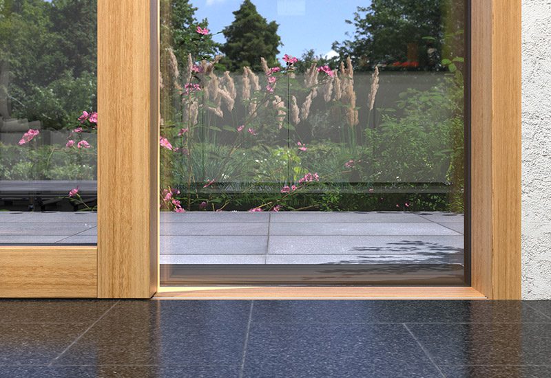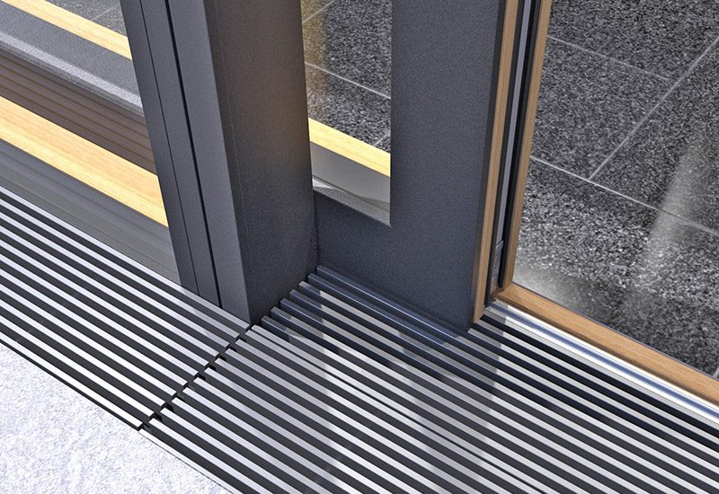 - Nullbarriere-Bodenschwellensystem mit hochwertigem Drainage-Gitterrost im Durchgang (äußere Drainageanbindung bauseitig)